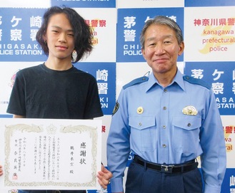 茅ケ崎警察署(奈良英俊署長)は8月20日、人命救助の功労で、鶴井来(らい)空(く)さん(寒川高校2年)に感謝状を贈呈した。