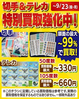 「おたからや茅ヶ崎元町店」と「おたからや寒川大曲店」では現在、切手とテレカの特別買取強化を行っている。切手は破れていたり汚れていてもOK。バラでもシートでも額面の最大〜99%で買取!テレカは50度数が最大〜330円、105度数が最大〜660円と驚きの買取価格だ。「テレカは買取中止間近とも言われています。使わないのであれば、現金化をお勧めします」とスタッフ。