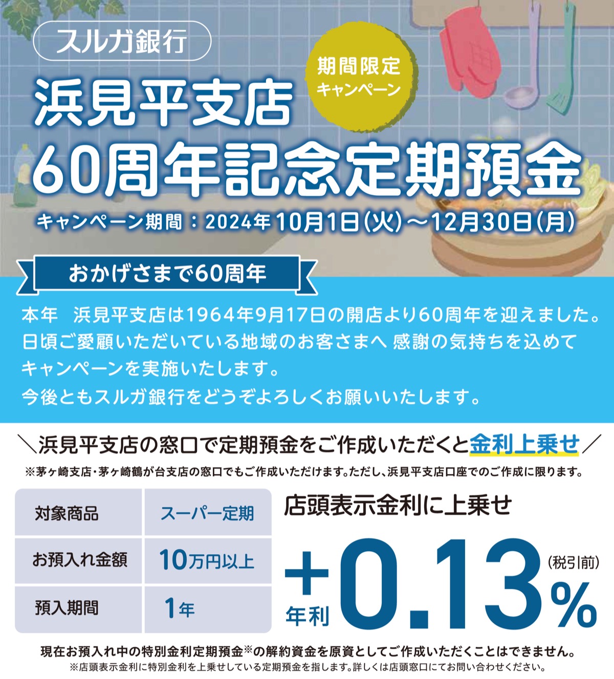 長きにわたる地域からの愛顧に対する感謝企画となる「60周年記念定期預金」は、スーパー定期(1年)を浜見平支店窓口で作成すると、店頭表示金利に年利0・13%の特別金利を上乗せするというもの(同支店口座限定)。なお、浜見平支店口座での作成であれば、茅ヶ崎支店、茅ヶ崎鶴が台支店での受付も可能。将来に向けた資産づくりや退職金の預け先など、この機会に地元で長く愛されるスルガ銀行を賢く活用してみては。
