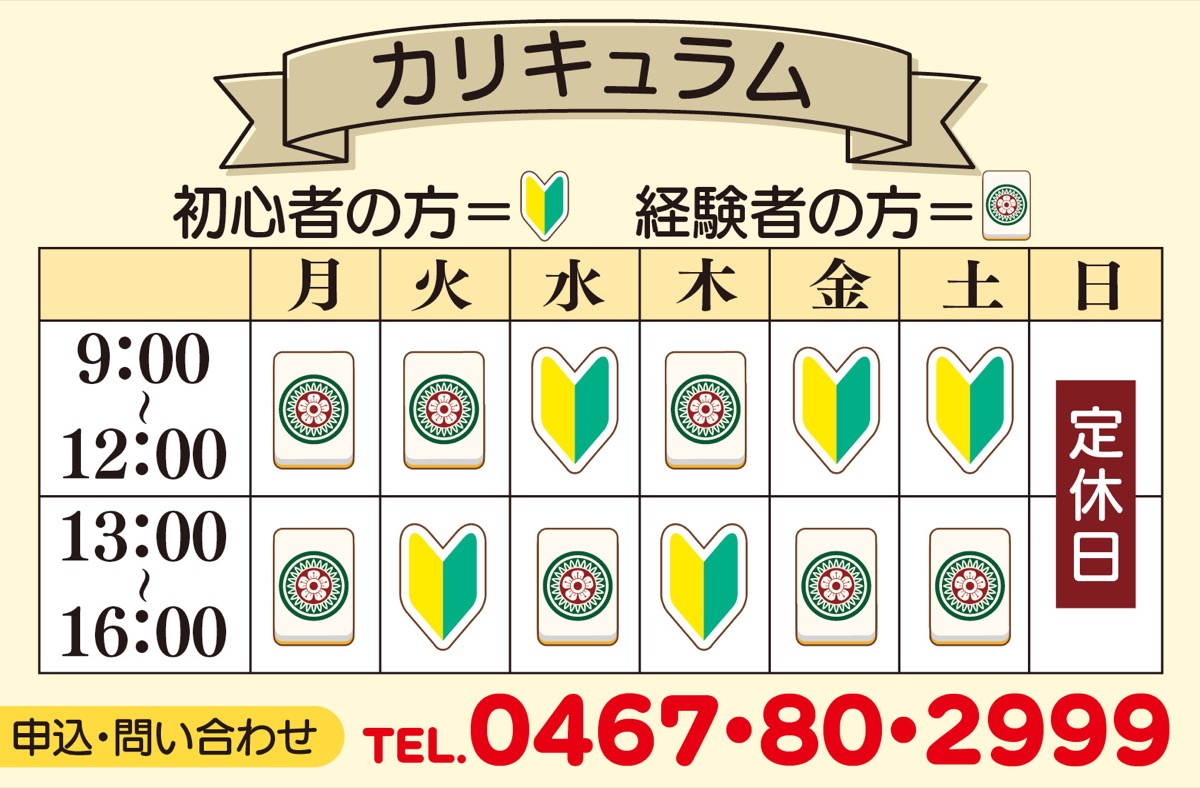 茅ケ崎駅南口徒歩6分の女性専用健康麻雀教室「らっふる」(幸町16の4クラブライフビル1F)が初心者教室の2期生を募集する。10月の3週目から3カ月間のコースで、1回2000円(当日払い)。1週目は完全無料だからお得だ。