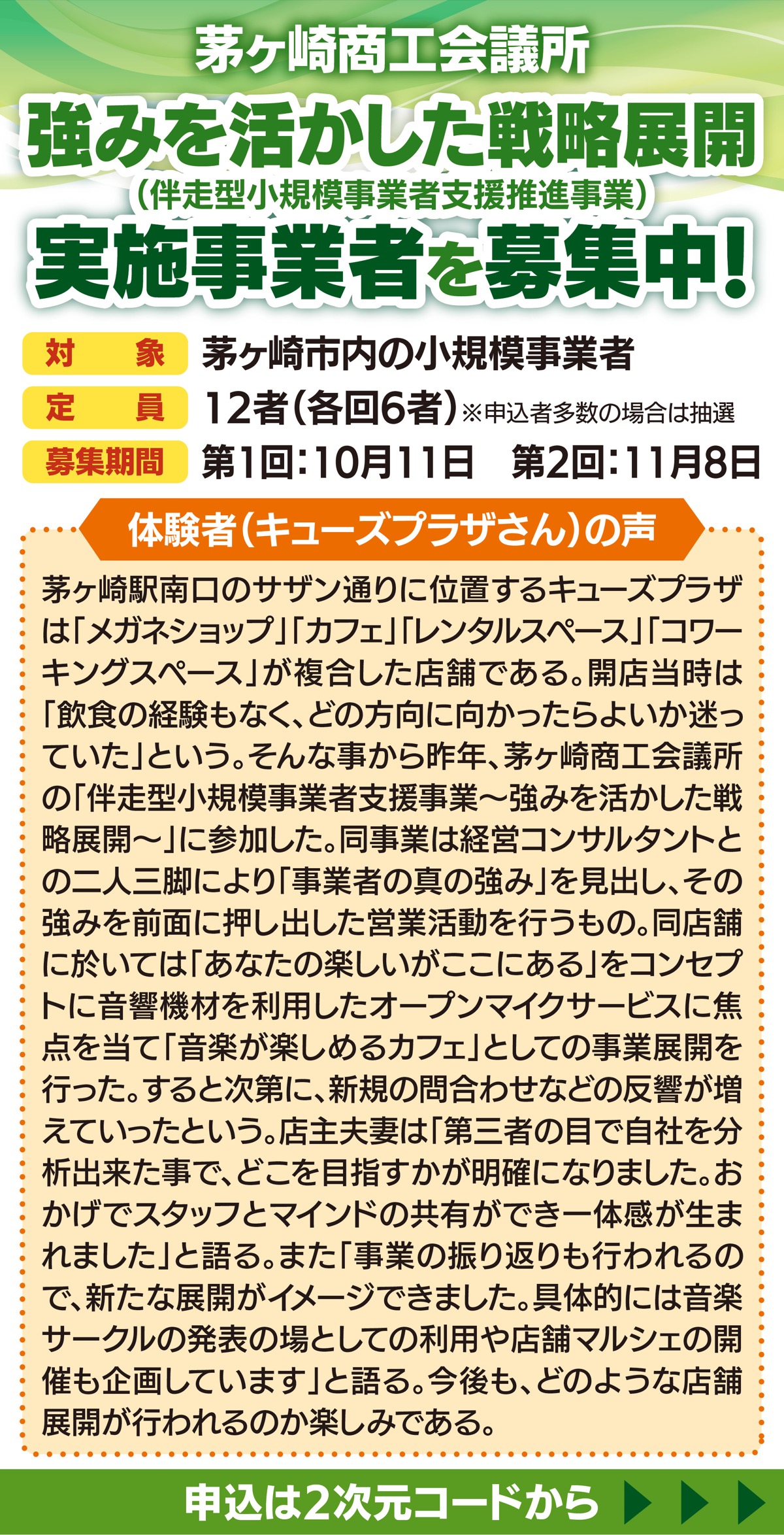茅ヶ崎商工会議所では小規模事業者の強みを生かした経営戦略を経営コンサルタントとともに推進してもらおうと、伴走型小規模事業者支援推進事業を実施する。申し込みを受付中。参加無料。