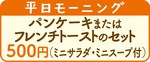 通常モーニングは朝7時〜。パンケーキ、フレンチトーストのセットはミニサラダ・ミニスープ付500円。