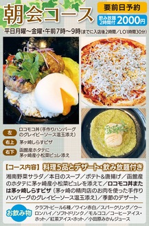 「茅ヶ崎ビール」ブルワリーレストランでは多くの要望に応え、「朝会コース」を実施する。前日までの完全予約制で、月曜〜金曜午前7時〜9時までに入店後2時間。