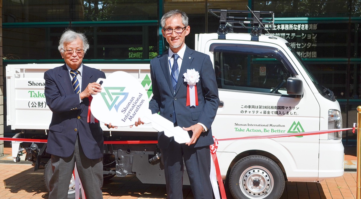 湘南国際マラソン実行委員会はこのほど、海岸清掃車両を、公益財団法人かながわ海岸美化財団(本部・茅ヶ崎市汐見台)に寄付した。