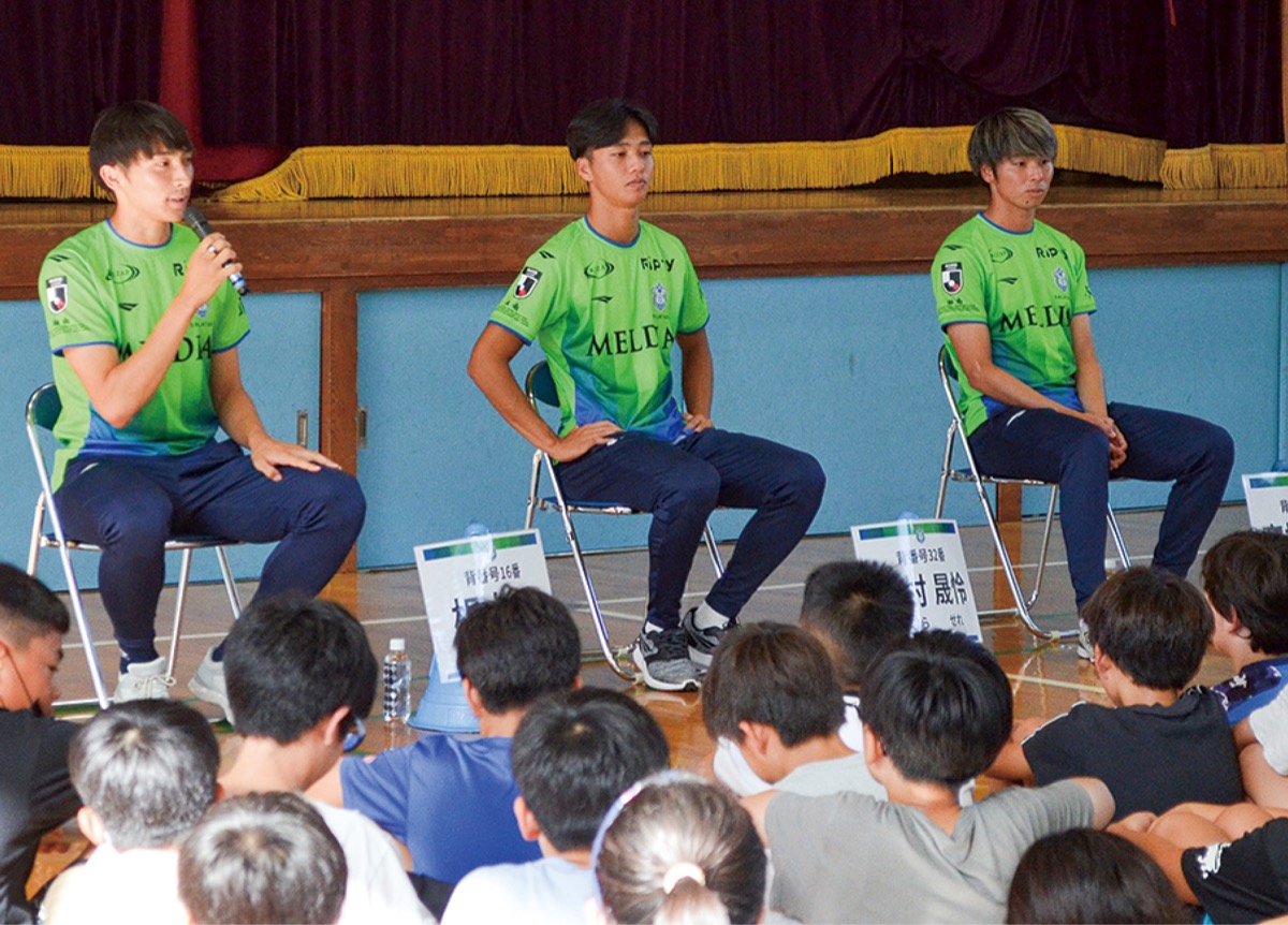 根本選手は「小学生の頃は無我夢中でサッカーをしていた。けがで辛いときにも、どうするのがベストか考え行動した。苦しい状況にあっても頑張れるかが重要」と話し、最後に「僕たちも試合で勝てるよう頑張るから、みんなも夢に向かって突っ走ってほしい」とエールを送った。