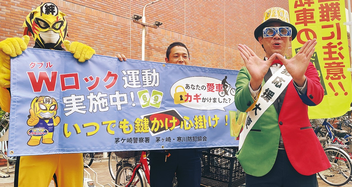 カードゲームのUNO芸人・ウノ山本さん=写真右=を防犯応援大使に任命。茅ケ崎駅周辺の駐輪場を回りながら、チェーンロックを配布し、道行く人や周辺店舗に立ち寄り、「自転車に二重に鍵をかける『Wロック』で自転車盗を防ぎましょう」と呼び掛けた。