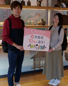 10万人目の来館者となったのは同市松風台在住の蔀(しどみ)さん一家。この日は「散歩のついでにふらっと立ち寄った」という。記念として同館のキャラクターグッズなどが贈られると「明るくてとてもきれいな博物館ですね」と笑顔を見せた。