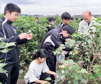 指先で一つ一つ丁寧に摘みとりを行った生徒は、「ふわふわしていて、触ると気持ちがいい」「これが洋服になるなんて信じられない」と思い思いの感想を述べた。また、木村町長は、「町で採れたコットンを使ったシャツになるという。いずれ、ふるさと納税の返礼品などにもなれば」と話していた。