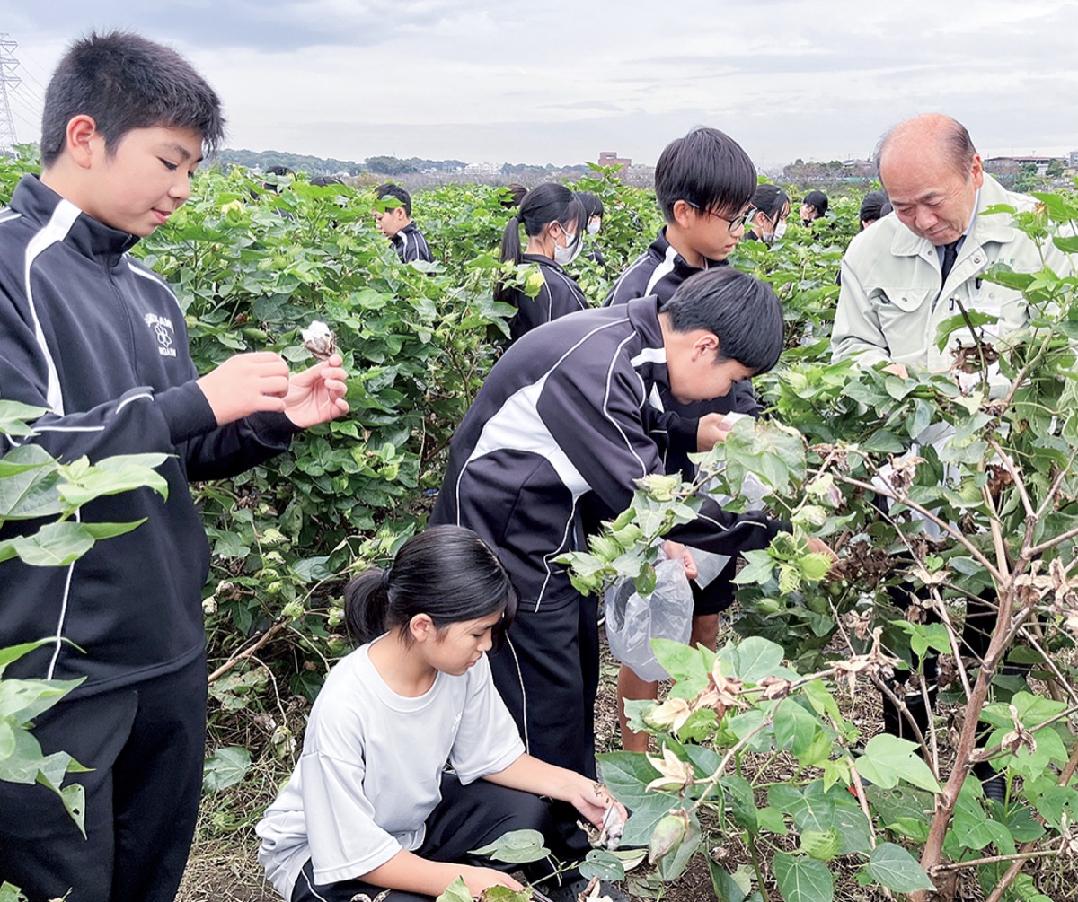 寒川町内の休耕地(岡田)で11月1日、メーカーズシャツ鎌倉(株)(本社/鎌倉市、以下鎌倉シャツ)が今春から栽培してきた超長綿の収穫を、寒川東中学校1年の生徒約130人と一緒に行った。収穫されたコットンは、約1年間の製作期間を経てドレスシャツとなり、同社から販売される。