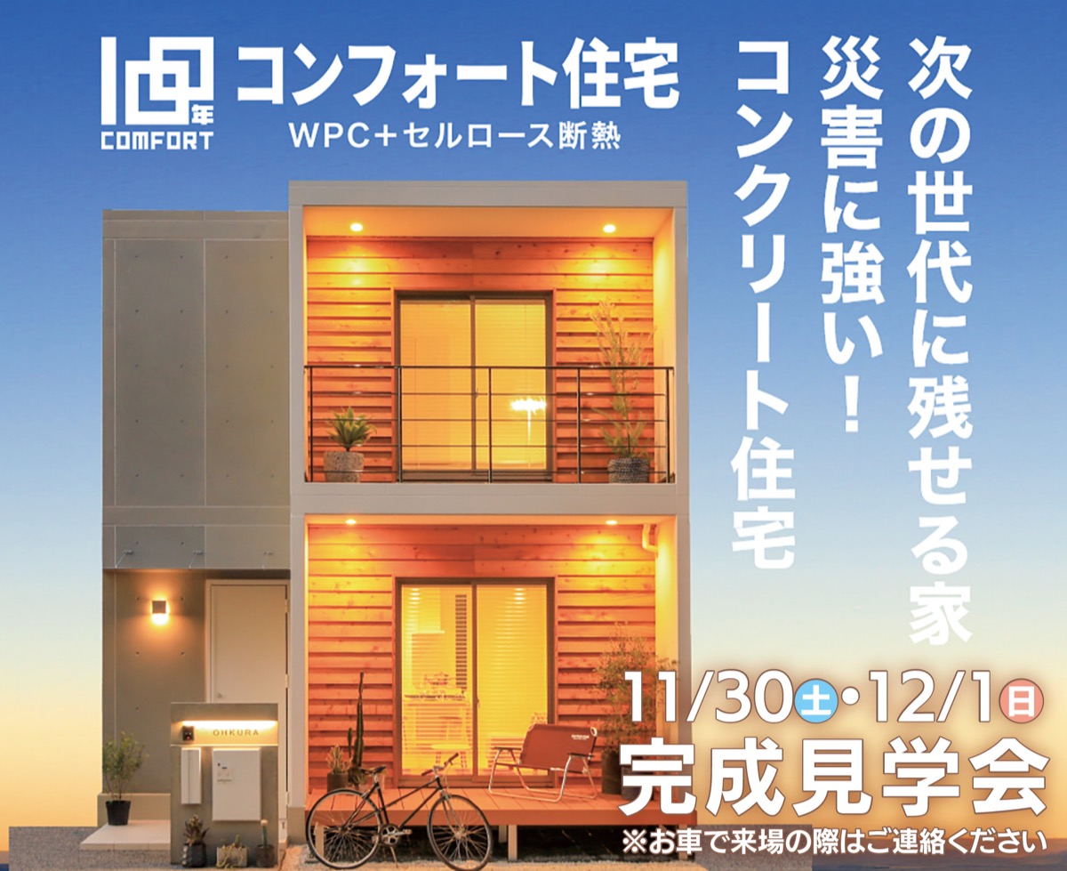 見学会は午前10時から午後3時。来場者プレゼントもご用意。住宅地で駐車場が限られるため、車で来場の際は事前に電話を。この機会に、「次の世代に残せる家 災害に強い!コンクリート住宅」をその目で確かめてみてほしい。