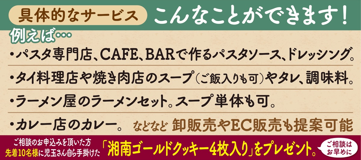 コロナ禍が明け、ようやく日常が戻ってきた頃、「次に同じような事態に見舞われたら、もう飲食の提供だけでは生き残れない」といった危機感から焼き菓子を作って物販に挑戦している飲食店を知った児玉さんは、自社の商品開発のノウハウを飲食店に提案、提供して本格的な商品づくりと販売支援を行いたいと今回、飲食店特化型の商品開発と販路を支援するサービスの展開を決めた。
