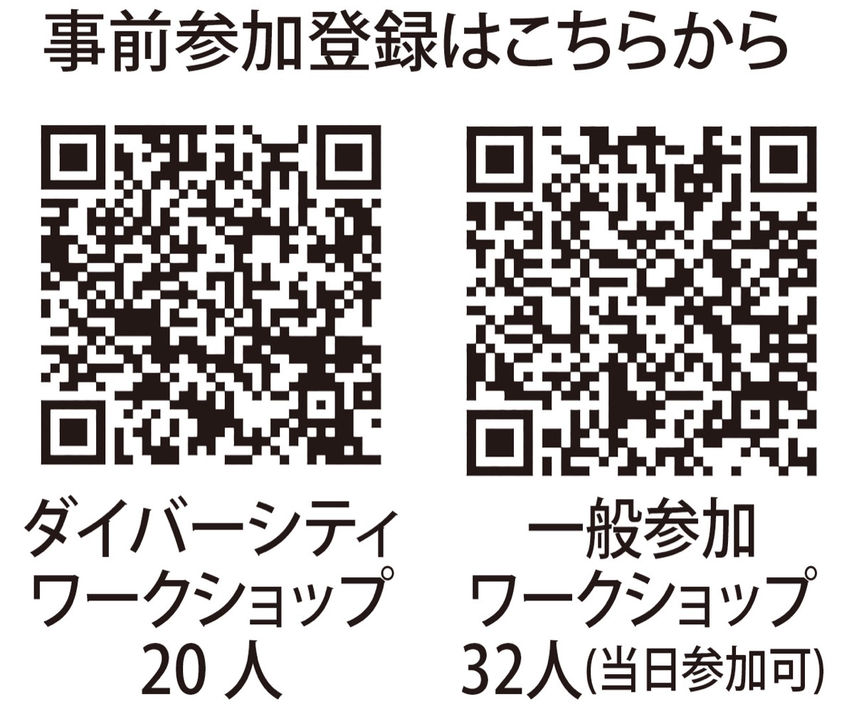 ダイバーシティワークショップ 【URL】https://x.gd/LaqOg(20人枠)、一般参加ワークショップ 【URL】https://x.gd/5ySjk(32人枠、当日参加可)へ。