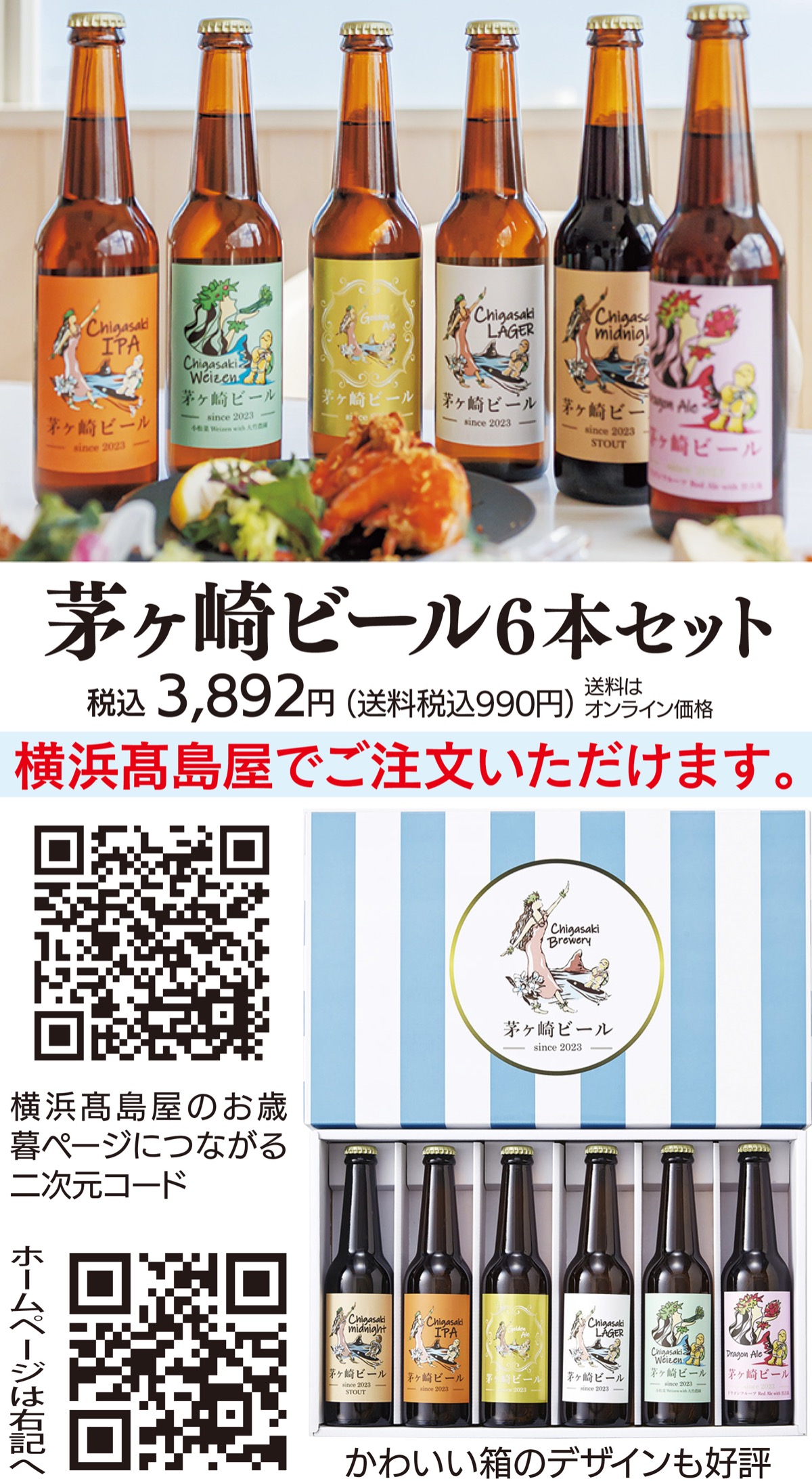 今年のお歳暮なら、贈られてうれしい地元のクラフトビールはいかがだろう。サザンビーチ沿いのブルワリーでつくられている「茅ヶ崎ビール」が、横浜高島屋のギフトセンター、または、同オンラインストアで注文を受け付けており、人気を博している。横浜高島屋地下1階のお酒売り場では1本から購入することもできる。帰省みやげにもピッタリだ。