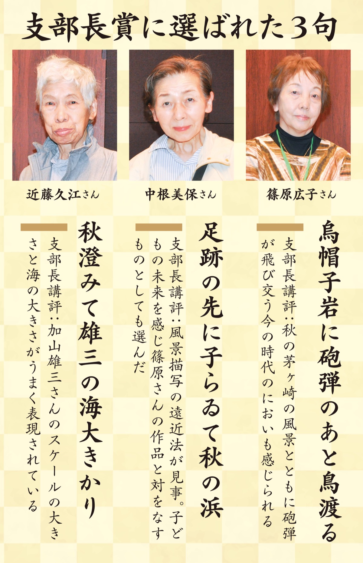 約470句から「支部長賞」に選出されたのは左の3句。篠原広子さんは「戦後、烏帽子岩が米軍の射撃訓練の標的にされたと知った驚きを詠んだ」、中根美保さんは「実際にサザンビーチで見かけた景色で、茅ヶ崎の海の穏やかさを感じた」、近藤久江さんは「茅ヶ崎と聞いてイメージした加山雄三さんと海の大きさを素直に表現できた」と話していた。