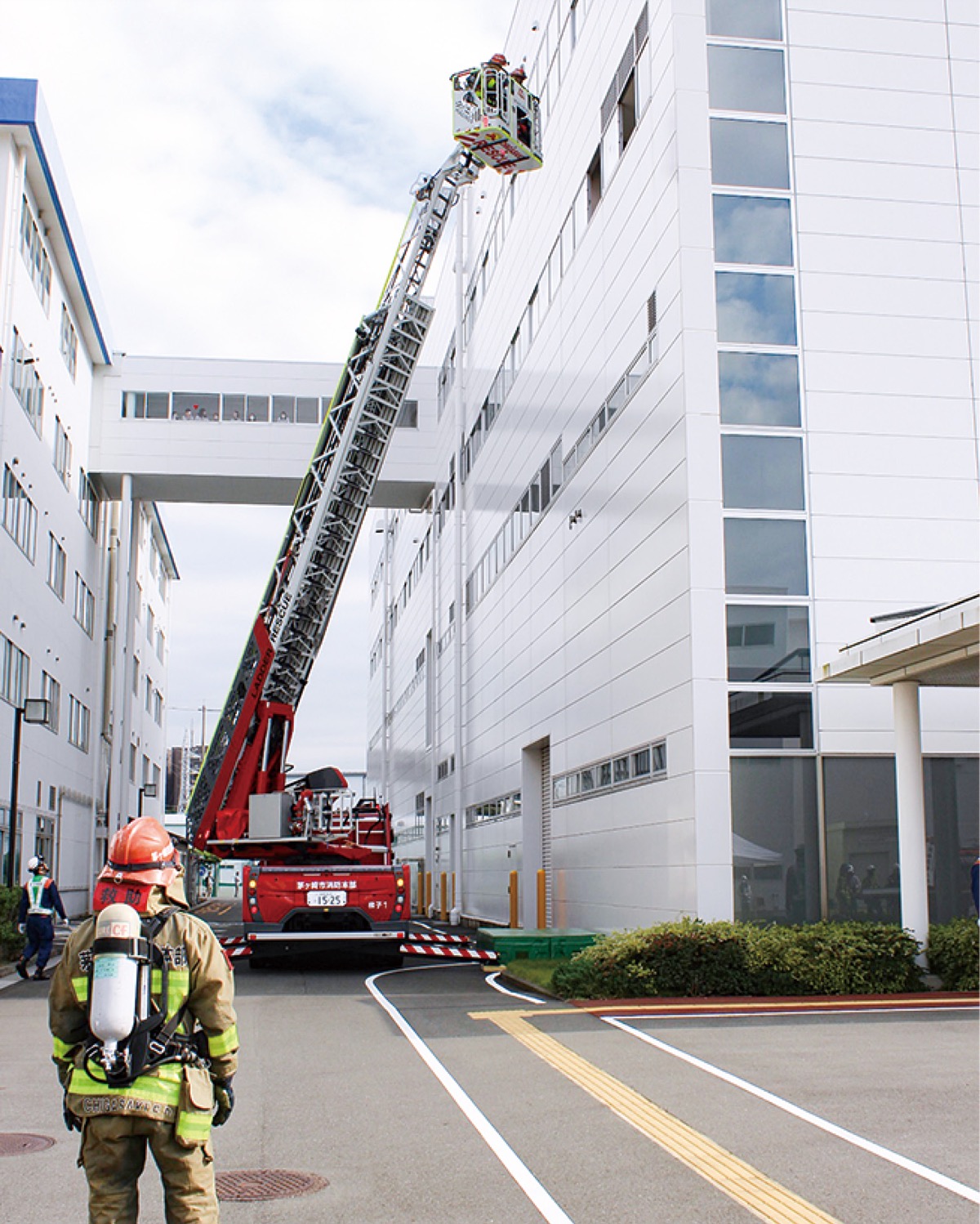 当日は地震発生後の火災を想定し、同組織による救助活動を実施。今年消防本部に導入されたはしご車も登場し本格的な訓練が行われた。