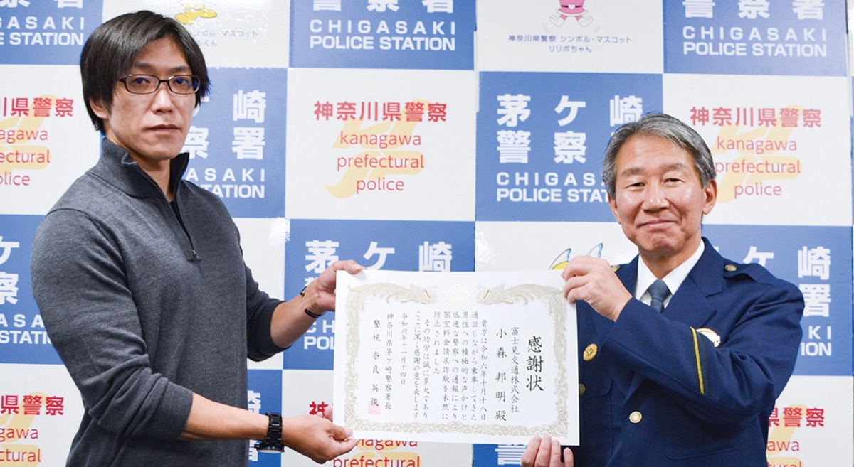 茅ケ崎警察署(奈良英俊署長)は11月14日、特殊詐欺の被害を防止したとして、富士見交通茅ヶ崎営業所のタクシー運転手、小森邦明さん(45)に感謝状を贈呈した。