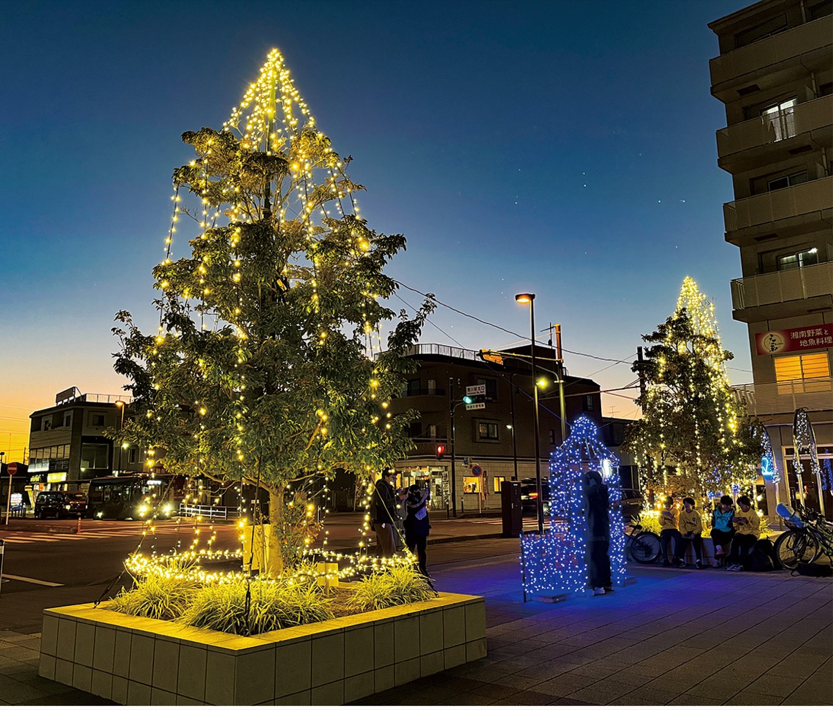 寒川駅北口駅前広場の冬の風物詩として定着したイルミネーション。今年もやわらかく灯り、道行く人が記念撮影などをしながら楽しんでいる。