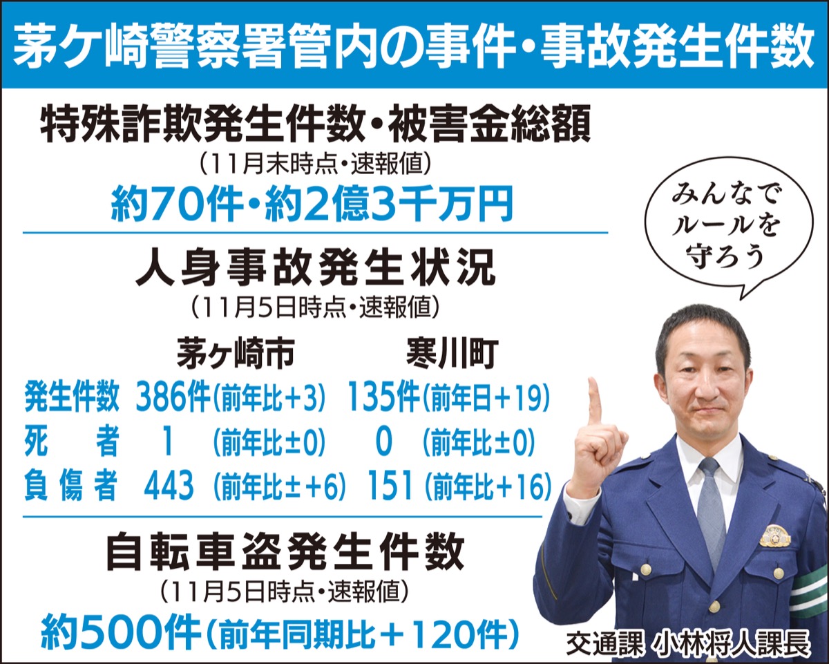 タウンニュース茅ヶ崎・寒川編集室では、茅ケ崎警察署(奈良英俊署長)の協力のもと、「安心・安全特別号」を企画した。本紙のインタビューに奈良署長は「『高齢者』と『自転車』に関係する事件・事故が多いのが管内の課題。何かと慌ただしい年末年始、自分が被害者や加害者にならないための備えを、もう一度考えてほしい」と呼びかける。