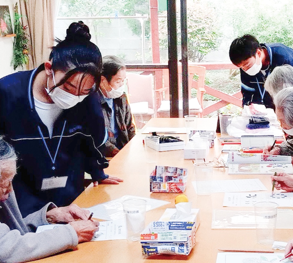 生徒たちはコミュニケーションを中心とした体験に臨み、脳トレーニングで一緒に考えたり、折り紙制作の補助を行った。「お手伝いできることはありますか」と積極的に話しかける姿に利用者からは笑顔が見られ、体験終了後には手を振って生徒たちを見送っていたという。