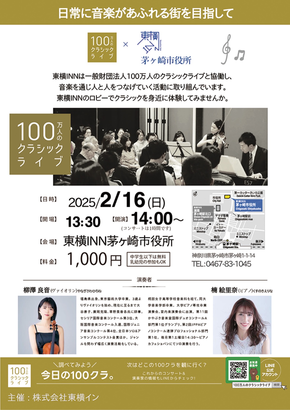 東横インは、(一財)100万人のクラシックライブが展開している音楽で人と人をつなげる活動に協力しており、同ライブもその一環。「普段着で聴けるクラシック」を掲げロビーで開催している。料金は1000円(中学生以下無料)。乳幼児も参加可。コンサートチケット持参で隣接の茅ヶ崎カフェのコーヒー、カフェラテが50円引きになるサービスも。