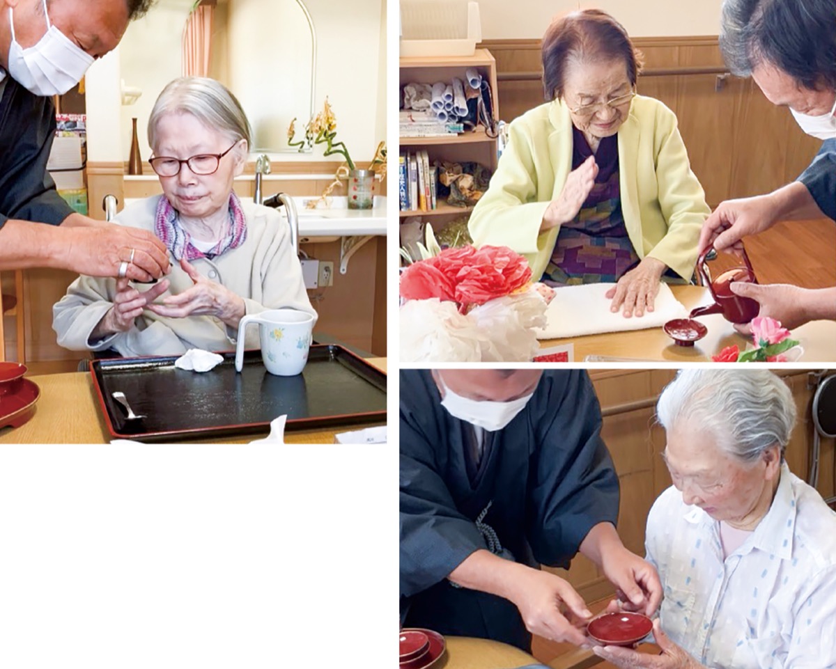 料理やレクリエーションなどを通じて季節を感じてもらおうと同施設で行っている活動の一環。食事を通じて正月の華やかさや幸福感を味わってもらおうと、見た目はもとより、旬の食材を使用するなど料理そのものにもこだわっている。加えて、古知屋施設長から希望者に健康長寿を願っておとそが振る舞われ、うれしそうな表情でたしなむ姿が見られた。