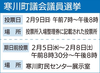 期日前投票は2月5日(水)から8日(土)の午前8時30分から午後8時まで、寒川町民センター展示室で可能。