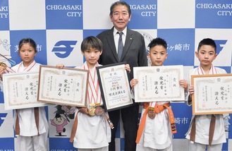 茅ヶ崎市を拠点に活動する「湘南KARATEclub夢源道場」(伊藤和航代表)に所属する小学生4人が1月27日、昨年12月に行われた第30回神奈川県少年少女空手道選手権大会で優秀な成績を収めたとして市長を表敬訪問した。