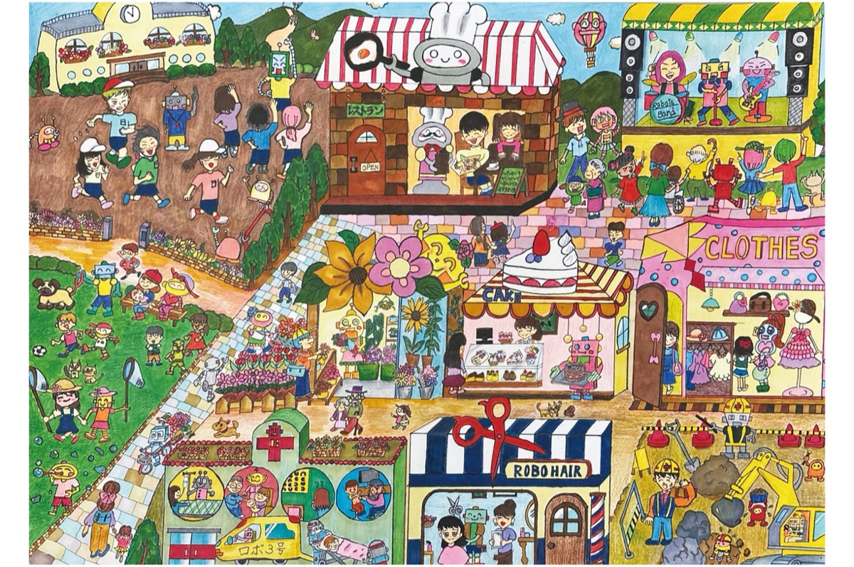 作品のタイトルは「住めたらいいなAIと暮らす世界」。中学生の兄がAIについて学んでいる姿を見てテーマを決めたという。ロボットと人間が日常生活を楽しむ姿が描かれており、大藤さんの「理想の世界」が表現されている。祖母からもらったという水彩色鉛筆を駆使し、絵の具では出せないグラデーションや複雑な色味を表現。全体のバランスや影の入れ方、人の表情まで細かいところにもこだわり抜き、多い日は1日に3〜4時間程制作に打ち込んだ。