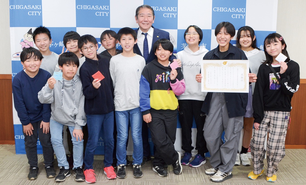梅田小学校の児童が2月13日、不要品回収プロジェクト(FKP)の売り上げ1万265円を、太陽光発電設備普及啓発基金と緑のまちづくり基金に寄付。佐藤光市長から感謝状が贈られた。