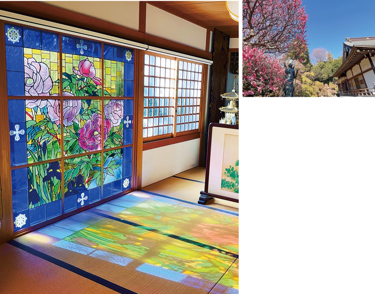 古墳や樹齢100年を超える桜など、さまざまな見どころがあるが、本堂の中にあるステンドグラスもその一つ。牡丹の花がデザインされ、陽光を取り込んで畳に色とりどりの模様を映し出している。