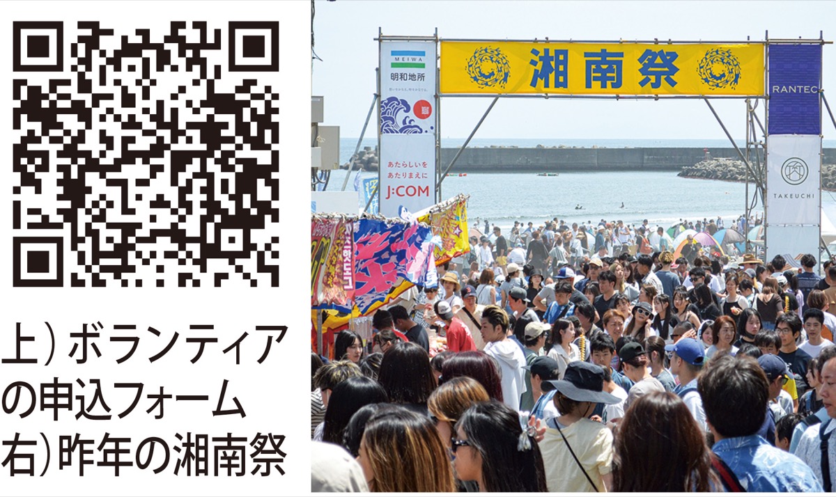 昨年は2日間で過去最多の延べ13万人(主催者発表)が来場するなど盛り上がりを見せた同祭。活気あるステージや出店だけでなく、能登復興支援として「輪島Tシャツ」を製作販売し80万円を寄付、イベントで出たゴミをトイレットペーパーにして資源循環するなどさまざまな活動に取り組んでいる。「私たちと湘南祭を盛り上げ各活動にも触れてほしい」と同実行委員会事務局。ボランティアの申し込みは上記二次元コードから。