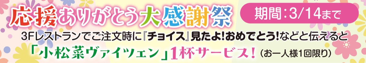 期間中は茅ヶ崎ビール3Fレストランで注文時に「『チョイス』見たよ!おめでとう!」などとキーワードを伝えると、認定を受けた「小松菜ヴァイツェン」が1杯サービス(1人1回限り)される。地元農家の大竹農園で丁寧に育てられた小松菜を使い、南ドイツ発祥の白ビールとコラボした逸品。苦みが少なくフルーティーな香りが特長のビールをぜひ。
