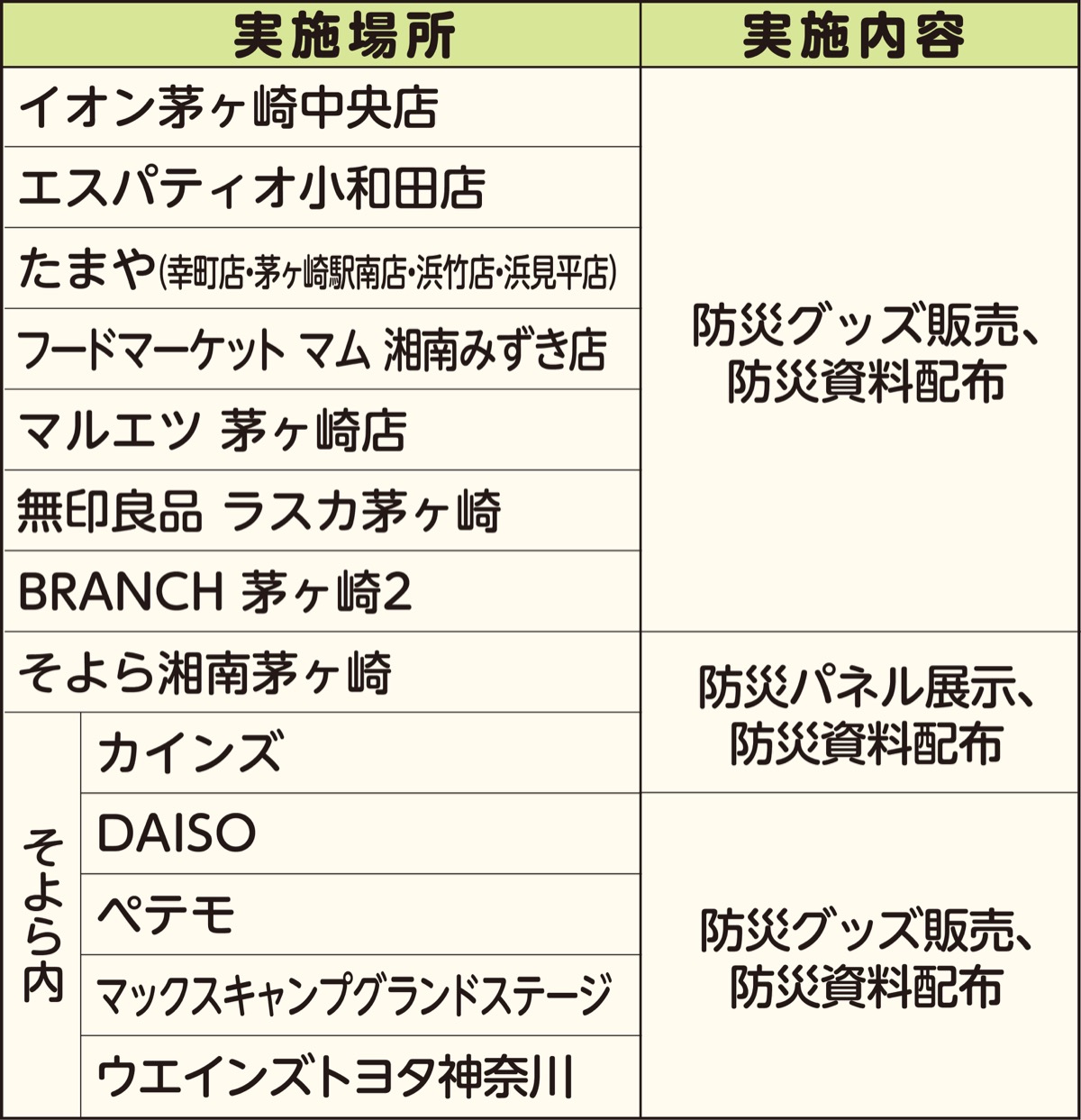 実施場所と催しの内容は表のとおり。