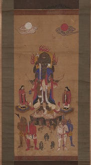 このオヒョウグには青面金剛(しょうめんこんごう)や三猿が描かれ、比較的近年に制作されたものと推測されます。下町では地神様の掛軸と一緒に床の間に飾り、線香や灯明、専用の食器に盛ったごちそうが供えられました。農作物の豊作を祈願する地神講の祭日に合わせられていることからも、茅ヶ崎では庚申様に農業の神の側面をより期待していたと考えられます。