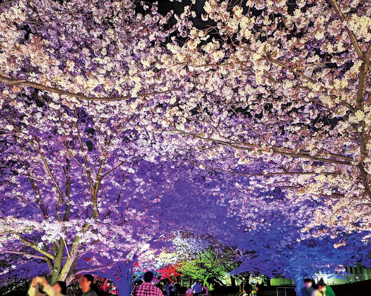 日没後の夜の部は、ジョギングコースに沿って約100mに渡りアーチ状に枝葉を伸ばした「桜のトンネル」=写真=をライトアップ。カラフルな照明で、幻想的でドラマチックな演出を企画している。主催は寒川町観光協会。午後6時から7時30分。雨天時は30日(日)に延期。