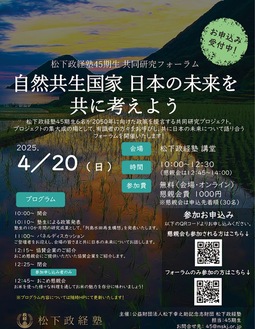 「自然共生国家 日本の未来を共に考えよう」と題するフォーラムが4月20日(日)、松下政経塾(茅ヶ崎市汐見台5の25)講堂で開催される。午前10時から12時30分。