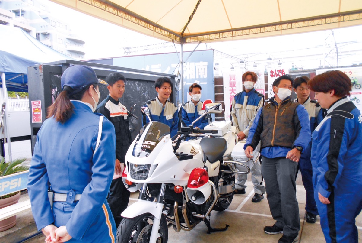 二輪車の運転者が多く集まる同社駐車場で、二輪車用エアバッグジャケットの有用性や右直事故の危険性などについて啓発。神奈川県警交通総務課「ホワイトエンジェルス」の隊員も来場し、白バイの展示・体験乗車や、反射材などの啓発グッズを配布するなどして、安全教育活動を行った。