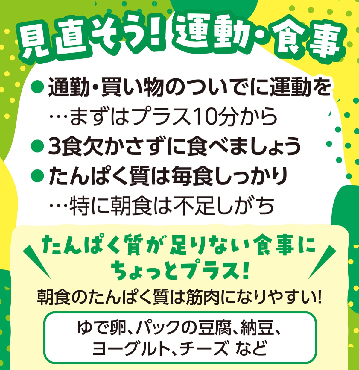 痩せすぎの方だけでなく、肥満の方も筋肉量が減少している可能性があります。適切な運動と食事で筋力の維持に努めましょう。特にたんぱく質不足は筋力低下の原因です。忙しい中でも、たんぱく質を3食食べるように意識しましょう。