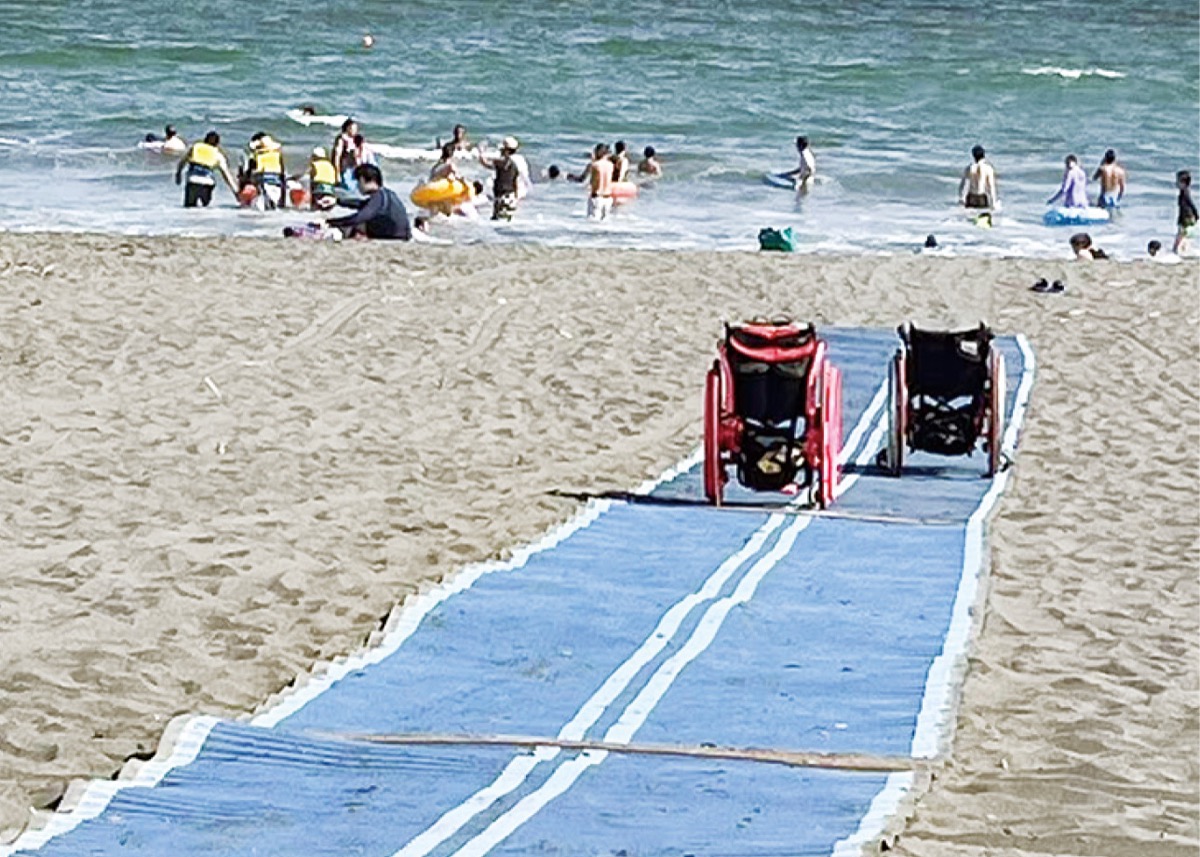 車いすやベビーカーでも波打ち際まで足を取られずに移動できるバリアフリーマットが設置されるほか、水陸両用の車いすの貸し出し(午前8時30分から午後4時まで)、アルミ製スロープの貸し出し(午前8時30分から午後5時まで)も行う。