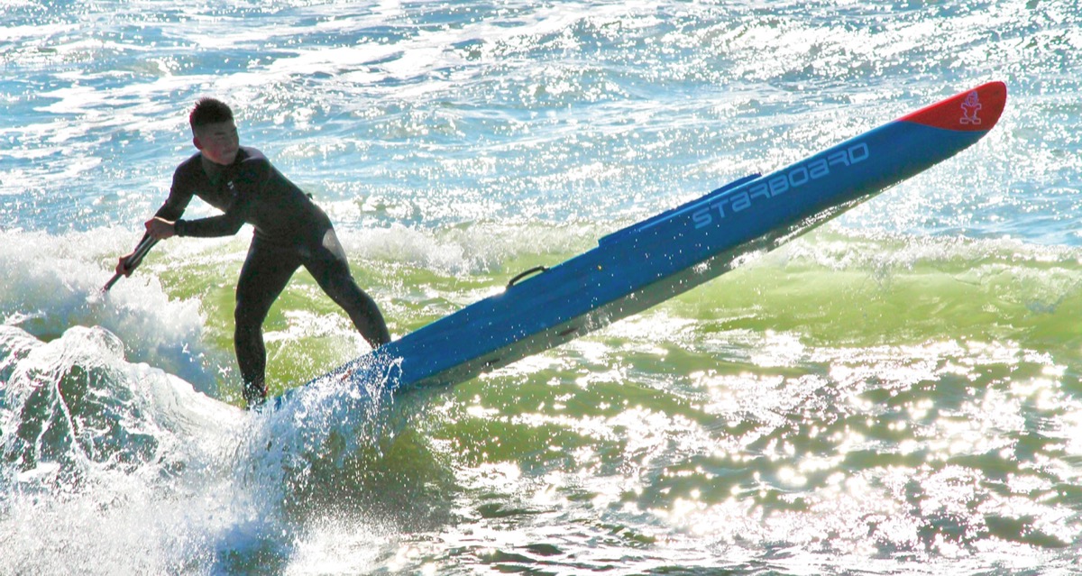 平田さんは競技歴9年。4月19日と20日に京都府で行われたJCF日本代表選手選考会のU―18部門に出場し、6Kmの距離をM字に岸から沖へ往復する「テクニカル」と、10Kmの長距離の速さを競う「ロングディスタンス」で、2位以下を大きく引き離して優勝した。「テクニカルでは思ったより波があったが、うまくつかめた」と振り返る。