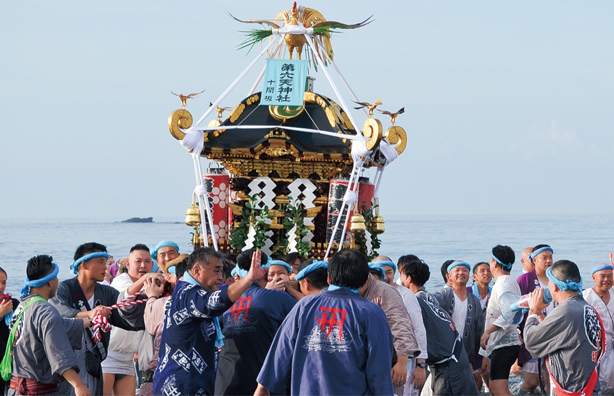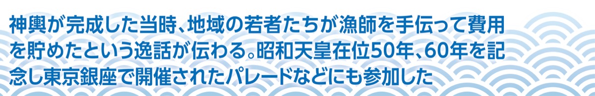 1892年に愛川町半原の名工の手で完成。4本の柱は1本の木から掘り出され、それぞれに精巧な彫り物が施されている。屋根が少し小ぶりで「バランスが良く美しい」のが自慢だ。総代代表の大森健一さん(79)は「10歳から浜降祭に参加しているから、まだ70回しか出たことがない(笑)。やっぱり地域にとって大切なお祭り。ずっと守っていきたい」
