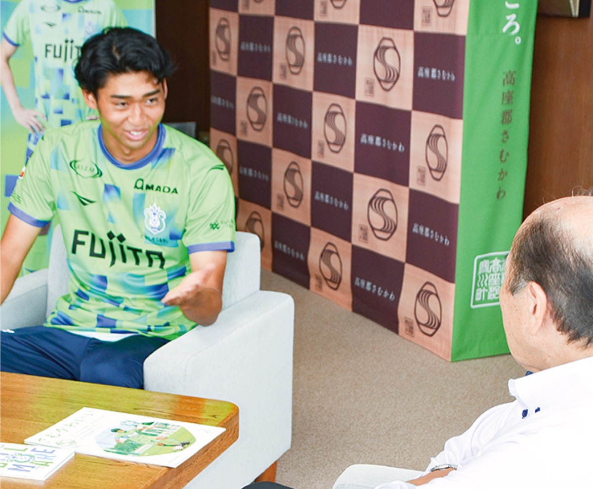 寒川町出身で、サッカーJ1リーグ・湘南ベルマーレに所属する本多康太郎選手(19)が7月11日、木村俊雄寒川町長を表敬訪問した。