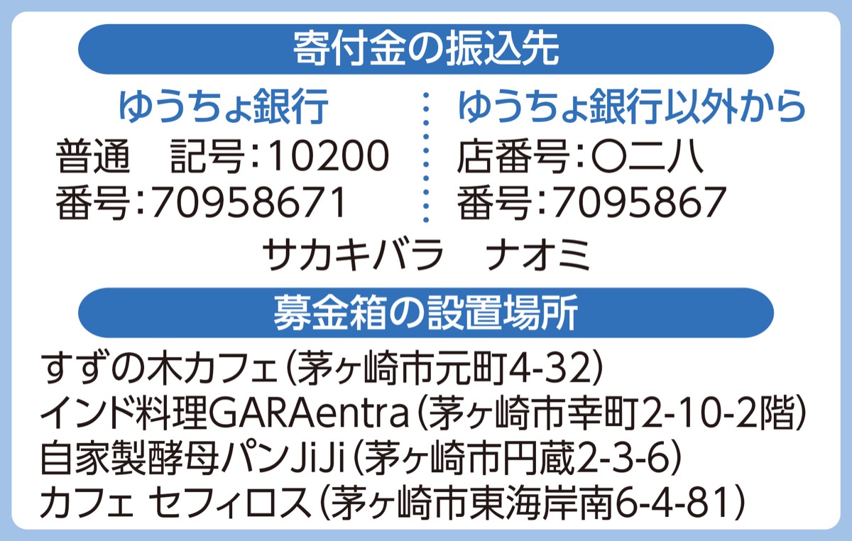 支援金は振込で受け付けているほか、募金箱を設置中(上の表を参照)。活動の状況はウェブサイト(https://kininaru-news.jimdofree.com/)で確認を。