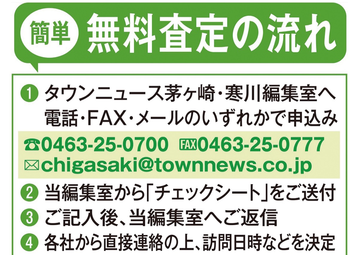 無料査定希望者は、タウンニュース茅ヶ崎・寒川編集室【電話】0463・25・0700、【FAX】0463・25・0777、【メール】chigasaki@townnews.co.jpのいずれかで問合せを。