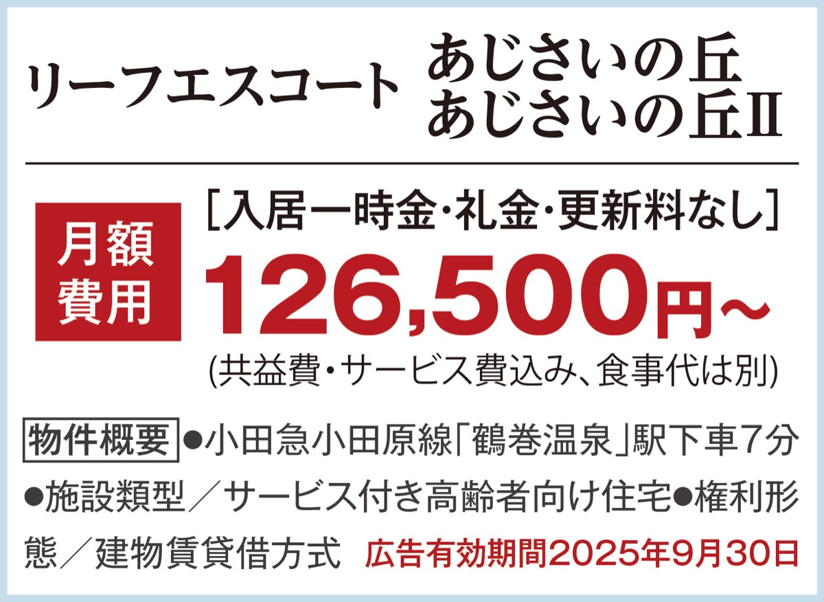 サービス付き高齢者向け住宅リーフエスコート「あじさいの丘」「あじさいの丘II」は、茅ヶ崎駅から59分の鶴巻温泉駅に位置。駅からは徒歩7分という好立地にある。同住宅は自立の人から要支援・要介護の人、単身・夫婦でも60歳以上であれば入居可能。外泊・外出も自由。趣味や旅行など、自分らしい”第二の人生”を過ごしたい人にはうってつけだ。