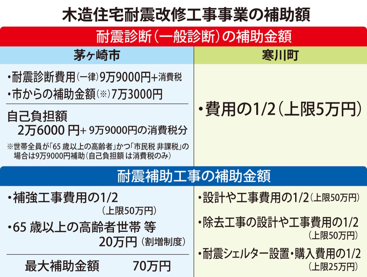 寒川町では、1981年5月31日以前に着工した旧耐震基準の木造住宅の耐震診断費用の2分の1(上限5万円)、耐震診断の結果、評点1・0未満の建物の耐震改修工事の設計や工事費用の2分の1(上限50万円)、木造住宅の除却工事の設計や工事費用の2分の1(上限50万円)を補助する制度を設けている。