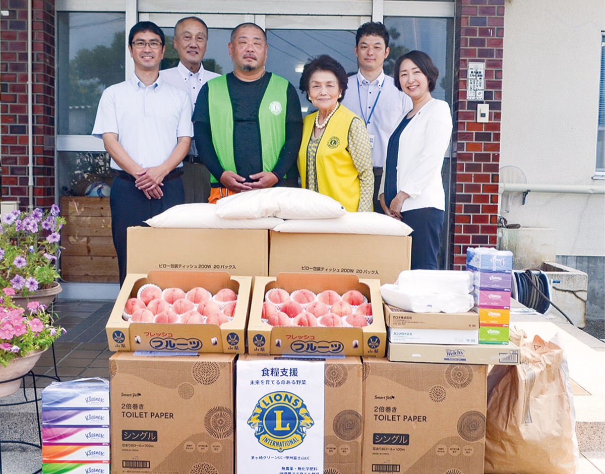 今回はティッシュペーパーなど日用品のほか、缶ジュースや米30kg、また友好クラブである「甲州富士山ライオンズクラブ」から寄贈された桃やじゃがいもなどの果物、野菜類を届けた。