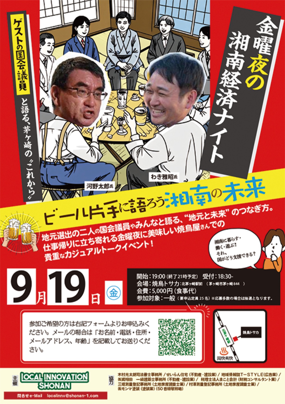 一般社団法人ローカルイノベーション湘南は9月19日(金)、河野太郎衆議院議員、脇雅昭参議院議員をゲストに招き、「ビール片手に語ろう湘南の未来」と題してトークイベントを焼鳥トサカ(北茅ヶ崎駅前/茅ヶ崎市茅ヶ崎844)で開催する。午後7時開始(6時30分受付)。会費は5000円(食事代)で、応募者多数時は抽選となる。