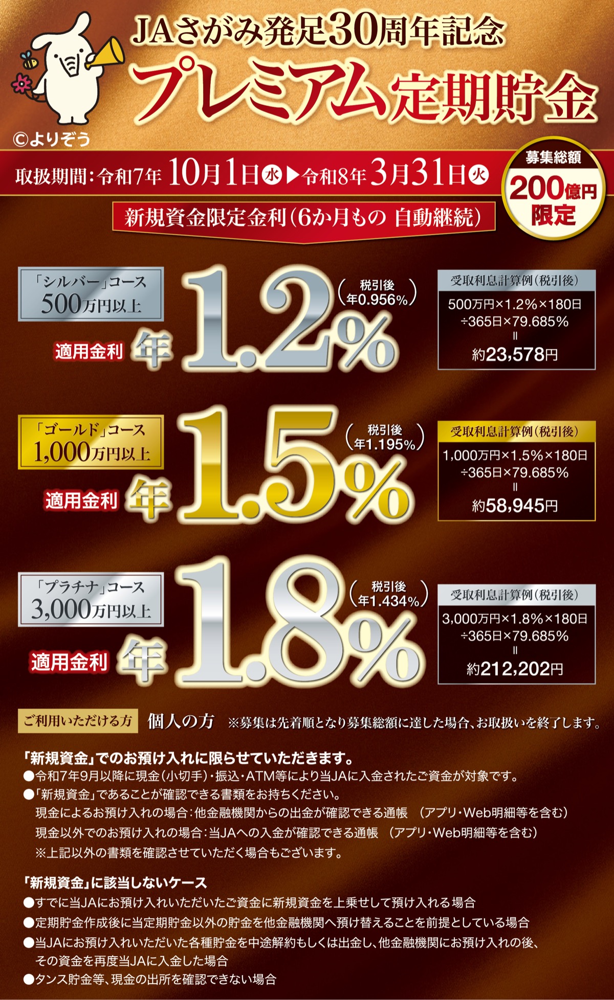 定期貯金は、期間6か月で最大1・8%の金利を適用する「プレミアム定期貯金」と、組合員を対象とした「特別定期貯金」。同組合は「農業従事者以外にも、JAさがみ管轄内にお住まいの方や組合員が対象のお得な定期貯金です。ぜひ気軽にご来店ください」と呼びかけている。
