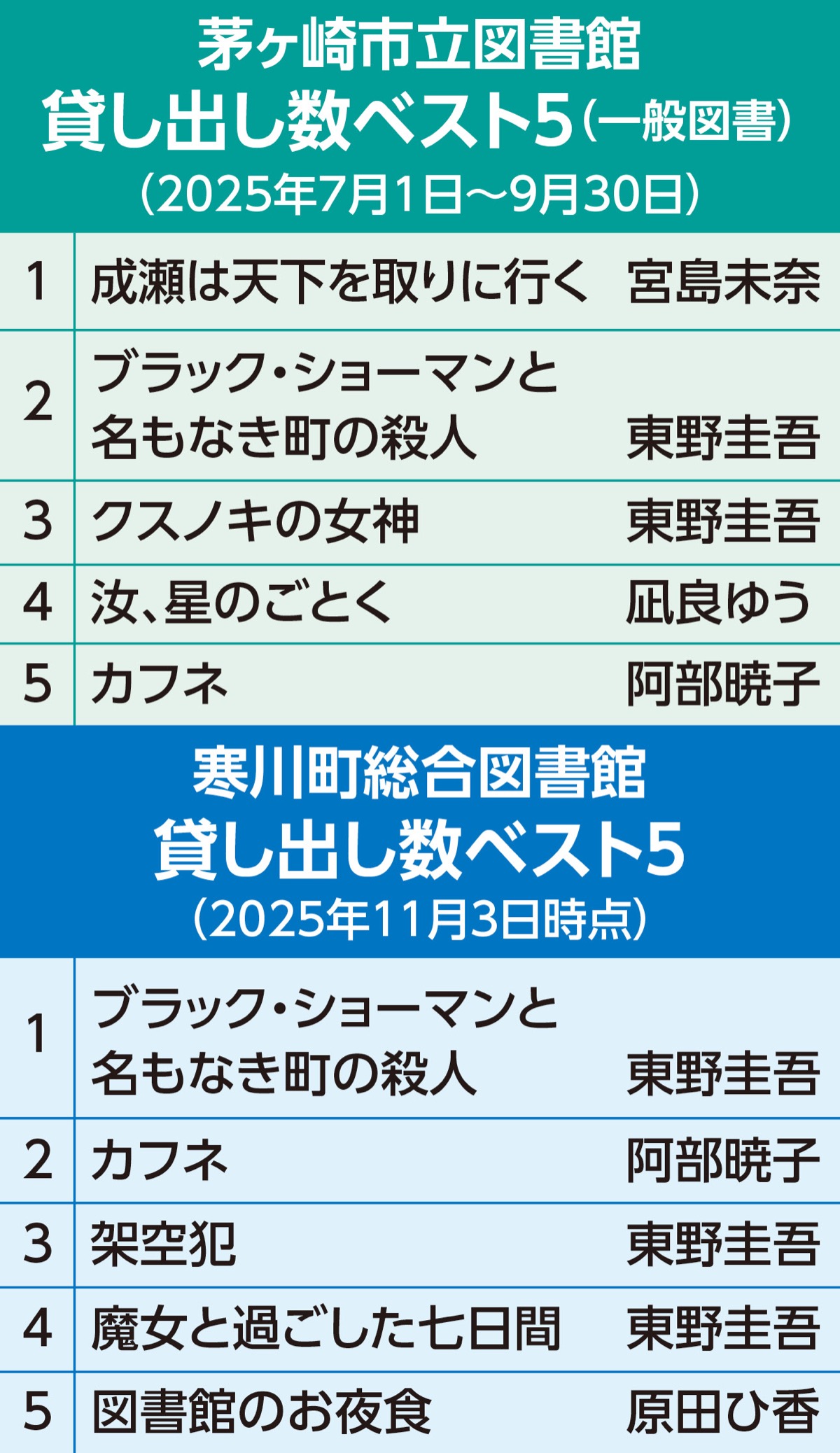 茅ヶ崎市立図書館で7月1日〜9月30日に貸出1位の『成瀬は天下を取りに行く』は昨年の年間貸し出し数もトップ。同館スタッフは「近年は本屋大賞を受賞した作品が多く読まれる傾向があります」と話す。また映像化の機会も多い東野圭吾さんの作品が両市町で強さを見せている。